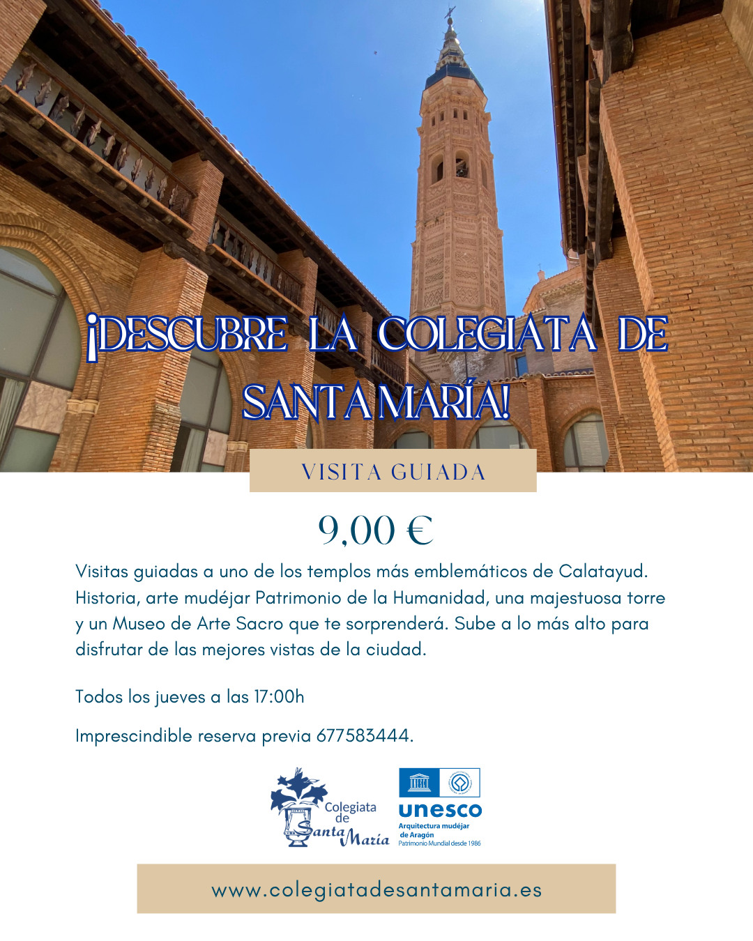 Cada jueves a las 17:00 h ofrecemos un recorrido completo por el interior de este impresionante edificio, declarado Patrimonio Mundial por la UNESCO dentro del conjunto de la Arquitectura Mudéjar de Aragón. Durante la visita descubrirás su historia, su patrimonio artístico, su imponente torre mudéjar —una de las más singulares de Aragón—, y el Museo de Arte Sacro, donde se conservan piezas únicas del legado espiritual y cultural de la ciudad.